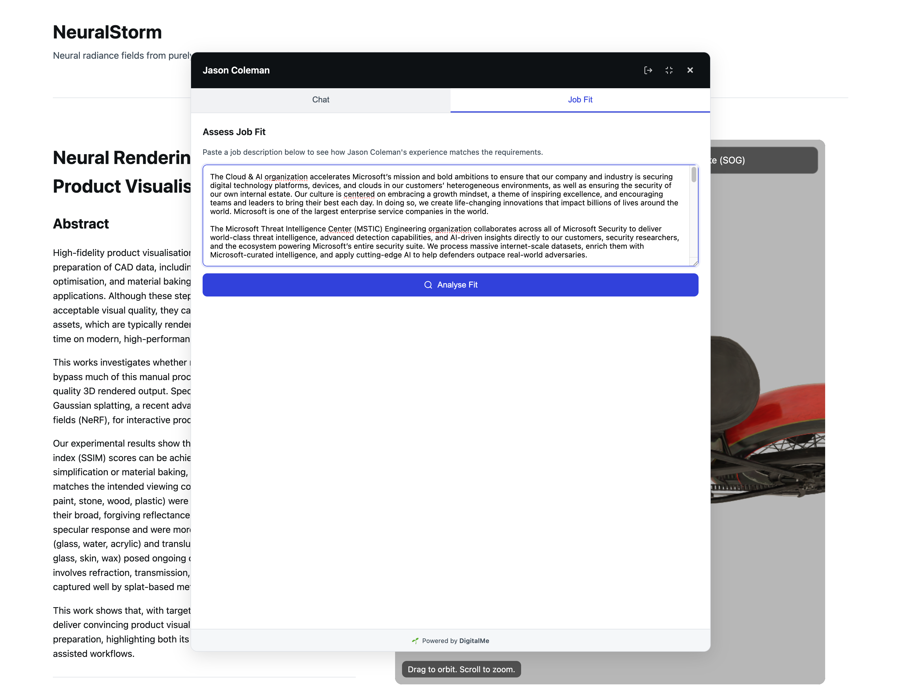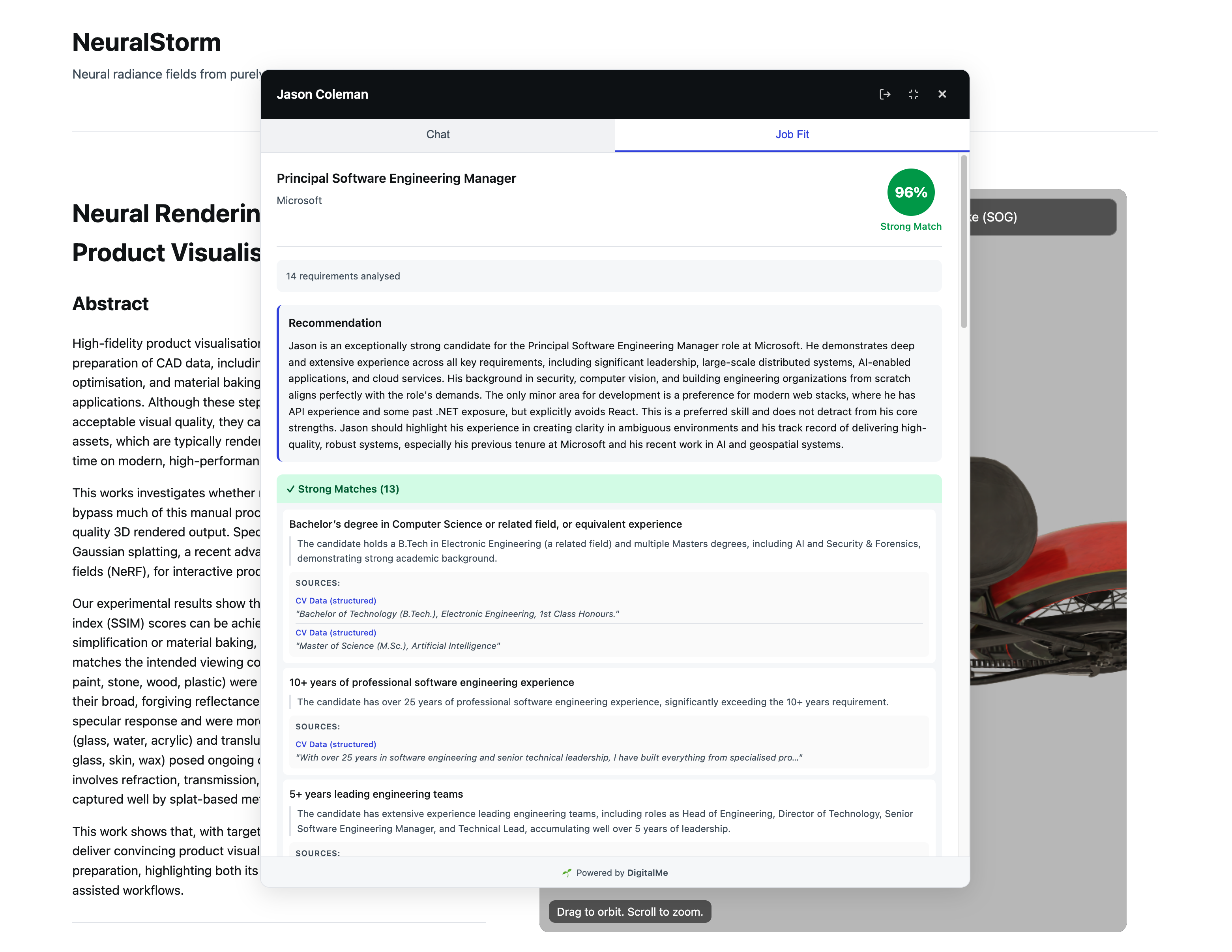 Visitors can chat with any candidate's digital twin. They can ask specific questions and get citation-backed answers. They can also run a job-fit analysis against a single candidate — paste a job description, hit analyse, and the system returns a match score with a full skills breakdown.2